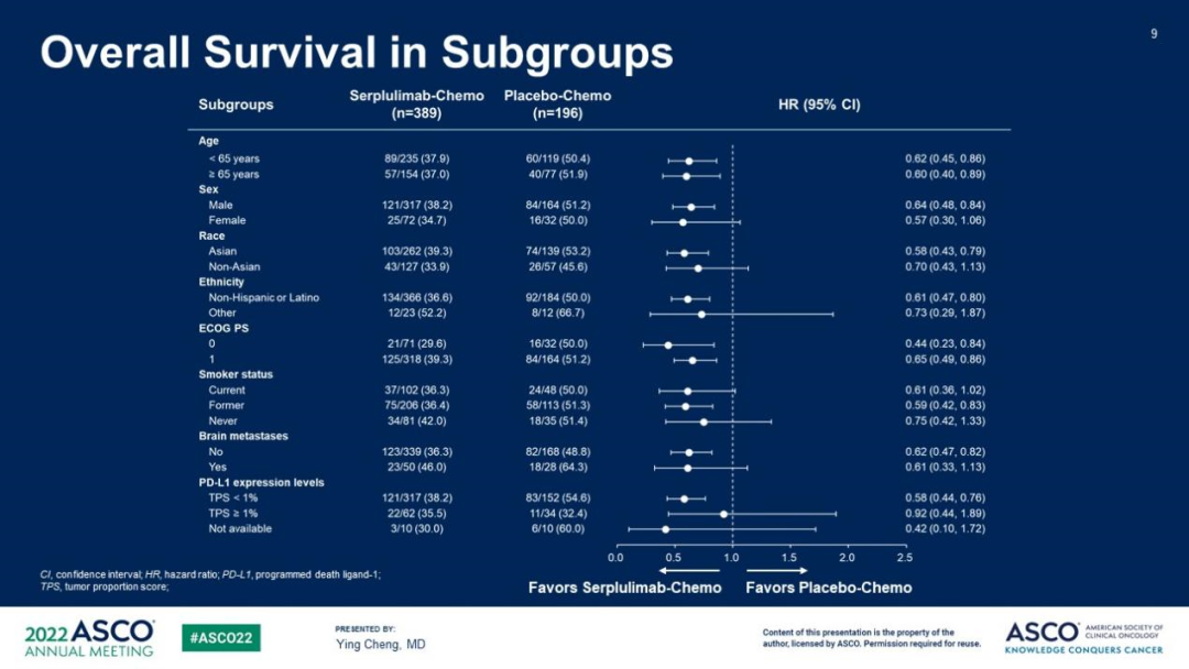 创造ES-SCLC一线治疗OS新纪录,2年OS率超化疗组5倍:本次中期分析数据截至2021年10月22日,中位随访12.3个月。主要终点结果中,斯鲁利单抗联合组与化疗组OS曲线早期持续分离,且前者优势幅度随时间推移明显增加(图2),中位OS较化疗组已显著延长了4.5个月[15.4个月(95%CI:13.3~NE)对10.9个月(95%CI:10.0~14.3)],突破了既往PD-L1抑制剂的获益幅度,并创造了ES-SCLC一线治疗OS新纪录,显著降低死亡风险37%[风险比(HR)=0.63,95%CI:0.49~0.82,P<0.001];12个月OS率分别为60.7%和47.8%,24个月OS率超过化疗组的5倍(43.1%对7.9%),即斯鲁利单抗联合组将近一半的患者OS已超过2年。且从OS曲线可以看到,斯鲁利单抗联合组自18个月起曲线就基本平稳,反映出免疫治疗特有的“拖尾效应”,意味着这部分患者有望获得更长生存。所有亚组均从斯鲁利单抗联合化疗中获得显著OS获益,包括PD-L1阳性和阴性亚组(图3)。亚裔人群分析也显示了一致获益。