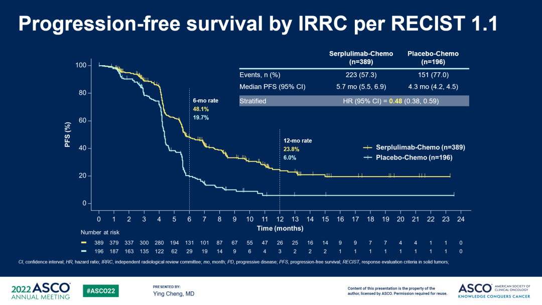 次要终点方面,斯鲁利单抗同样带来了PFS的显著延长,两组中位PFS分别是5.7个月 vs 4.3个月,疾病进展或死亡风险降低52%。6个月的PFS率分别为48.1%和19.7%,12个月的PFS率分别为23.8%和6.0%,提示接受斯鲁利单抗治疗将有近一半和近1/4的病人在半年和一年内不会出现疾病进展。