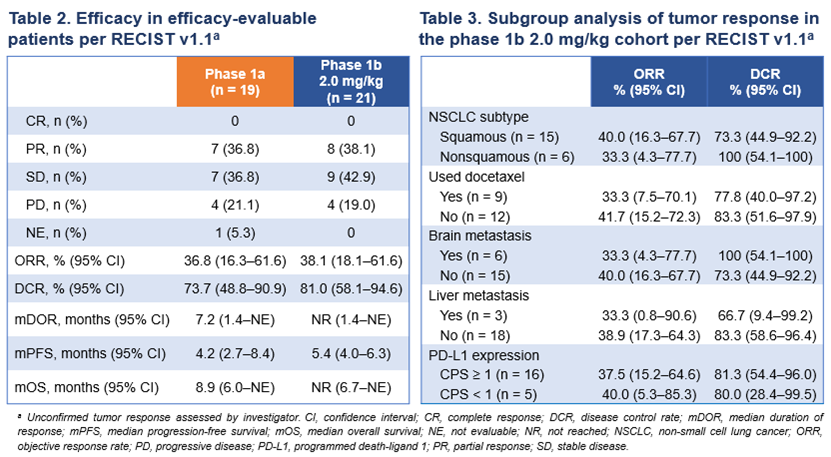 研究者评估的Ia期的客观缓解率(ORR)为36.8%;75%的胸腺鳞状细胞癌患者达到部分缓解(3/4名,ORR = 75%)。Ib期2.0 mg/kg组NSCLC患者经研究者评估的ORR为38.1%,其中鳞状NSCLC患者的ORR为40%。值得关注的是,脑转移NSCLC患者的疾病控制率(DCR)达到100%。