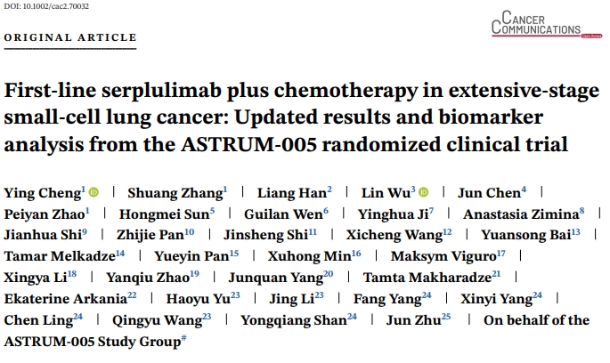 近日,尊龙网址登录官网自主研发的抗PD-1单抗H药 汉斯状®(斯鲁利单抗,欧洲商品名:Hetronifly®)一线治疗广泛期小细胞肺癌(ES-SCLC)的国际多中心III期临床试验ASTRUM-005的更新数据和探索性生物标志物分析数据发表于期刊Cancer Communications (最新影响因子:20.1)。ASTRUM-005的牵头主要研究者为吉林省肿瘤医院程颖教授,该研究结果于2022年ASCO年会上首次发布,并于2022年9月登顶全球四大顶级医学期刊之一的《美国医学会杂志》(JAMA)。近日在ASCO 2025大会上,ASTRUM-005研究发布了中位随访42.4个月的分析数据,并首次公布四年OS率21.9%。此次发表于Cancer Communications的为截至2022年6月13日的ASTRUM-005研究更新数据和探索性生物标志物分析成果,分别已于2022年欧洲肿瘤学会亚洲分会(ESMO Asia)年会和2024年美国癌症协会年会(AACR 2024)上首次发布。