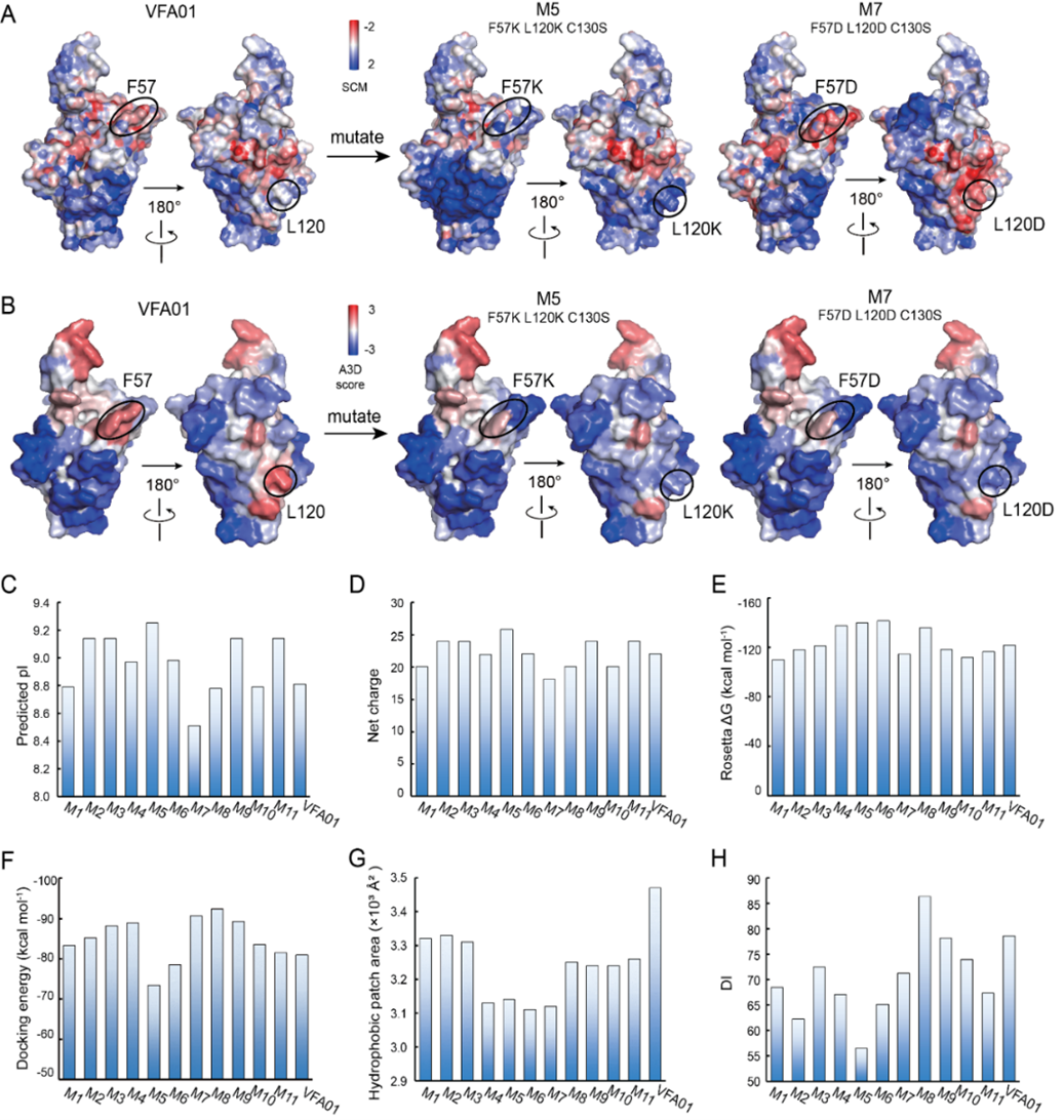 通過進一步的結合肽圖分析,研究人員確認了五個關鍵穩定性熱點氨基酸:C130、F57、Y106、L120和W111。基於這些發現,研究團隊對VFA01進行了系列變體設計,最終獲得經實驗驗證的高穩定性變體M11(C130S/W111F/F57K)。與原抗體VFA01相比,變體M11的穩定性顯著提升:亞微米級蛋白顆粒的聚集速率降低了6.2倍,100nm及以下蛋白顆粒的聚集速率降低了3.4倍,蛋白裂解速率降低了1.5倍;而且,M11的抗原結合親和力和蛋白質產量均提升了1.5倍。因此,該研究為VHH-Fc類融合抗體的開發提供了一條有效的穩定性優化途徑。