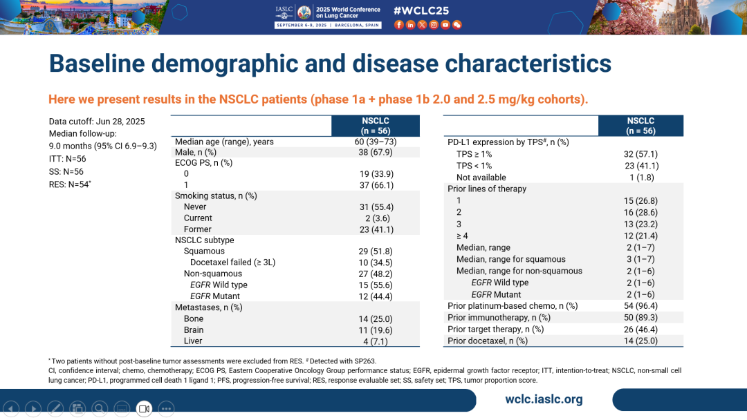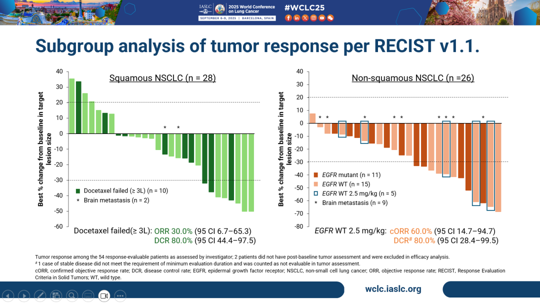• 截至數據截止日期2025年6月28日,共計56例NSCLC患者入組Ia期及Ib期2.0和2.5 mg/kg劑量組,其中29例(51.8%)為鱗狀,27例(48.2%)為非鱗狀。鱗狀NSCLC中,10例(34.5%)患者經多西他賽治療失敗。非鱗狀NSCLC中,EGFR野生型/突變患者分別為15例(55.6%)及12例(44.4%)。