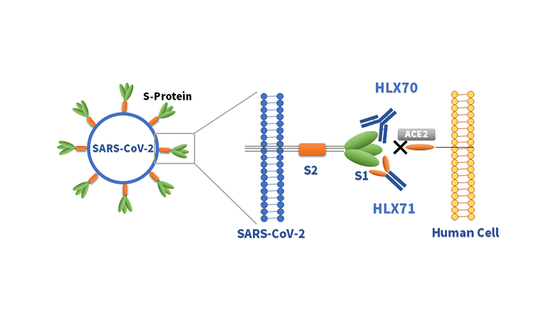 HLX71为尊龙网址登录官网自主开发的一款C末端带有IgG1 Fc的重组人血管紧张素转换酶2(human Angiotensin converting enzyme 2,hACE2)融合蛋白。新冠病毒感染人体细胞的关键步骤之一为病毒表面S蛋白S1亚基的受体结合区(Receptor binding domain,RDB)与人体细胞表面的hACE2蛋白结合,从而引发人体细胞的内吞作用将病毒吞入细胞内[1,2]。HLX71一端的ACE2蛋白可充当“诱饵”,与SARS-CoV-2病毒S蛋白的RBD区域结合,且具有较强的结合力,当HLX71与病毒的RBD区域结合后,可以阻断病毒与宿主细胞表面的ACE2结合,防止SARS-CoV-2病毒感染细胞,进而用于新冠肺炎的治疗。