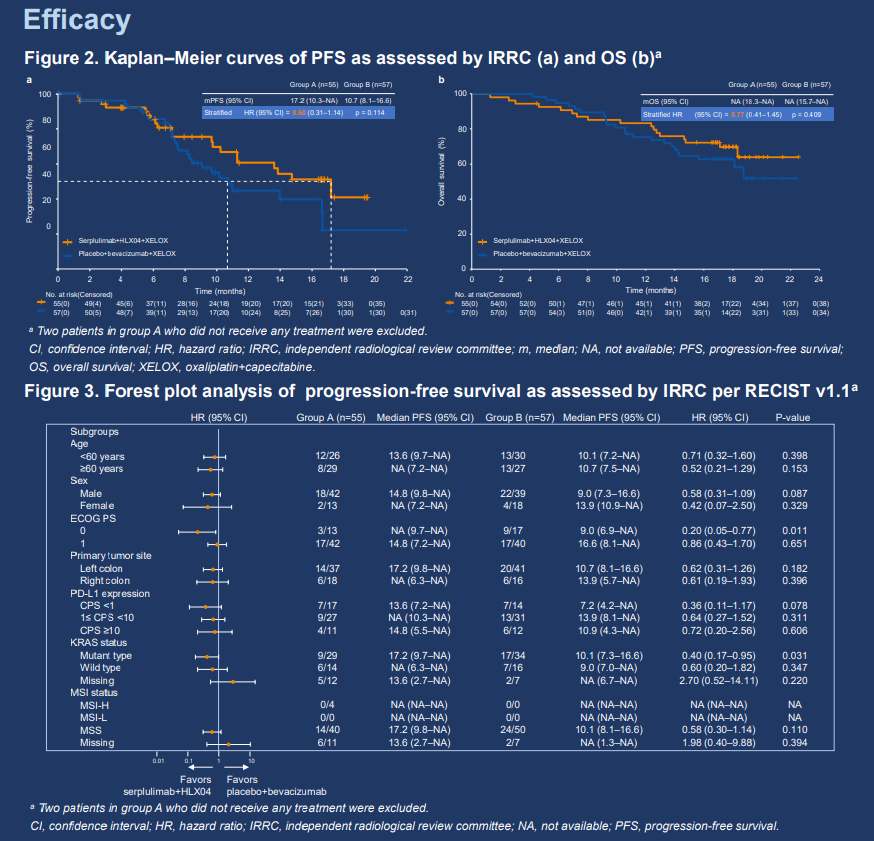 这是一项随机、双盲、多中心的II/III期研究;此次将侧重于介绍II期部分。既往未接受过系统性治疗的不可切除转移性/复发性结直肠腺癌患者按1:1的比例随机分组,分别接受斯鲁利单抗(300 mg,Q3W IV)联合HLX04(贝伐珠单抗,7.5 mg/kg,Q3W IV)和XELOX(A组)或安慰剂联合贝伐珠单抗和XELOX(B组)治疗。随机化按PD-L1表达水平(CPS <1 vs. 1≤ CPS <50 vs. CPS ≥50)、ECOG PS评分(0 vs. 1)和原发肿瘤部位(左侧 vs. 右侧)进行分层。主要终点是IRRC根据RECIST 1.1评估的PFS。次要终点包括其他疗效终点、安全性、药代动力学、生物标志物探索和生活质量评估。