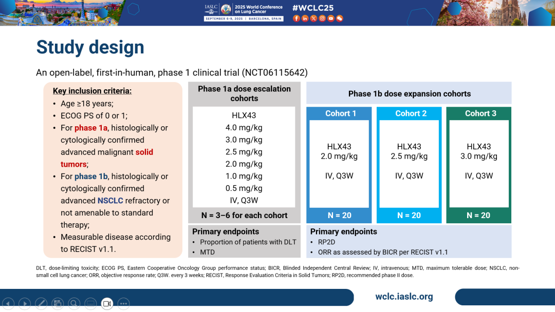 此次发布的更新研究数据来自一项开放标签、评估HLX43(抗 PD-L1 ADC)在晚期/转移性实体瘤患者中的安全性、药代动力学特征和初步疗效的首次人体 I 期临床研究(本次更新NSCLC人群数据)。研究包括Ia(剂量递增)的Ib期(剂量扩展)两个阶段。在Ia期中,组织学或细胞学确诊为晚期/转移性恶性实体瘤且对标准治疗无效或无法接受标准治疗的患者接受每三周一次(Q3W)0.5 mg/kg、1 mg/kg、2 mg/kg、2.5 mg/kg、3 mg/kg或4 mg/kg HLX43静脉注射。在Ib期中,对标准治疗无效的晚期/转移性NSCLC患者给与2mg/kg、2.5 mg/kg或3 mg/kg HLX43 (Q3W) 静脉注射,Ib期的主要终点为推荐的II期剂量(RP2D)和客观缓解率(ORR)。