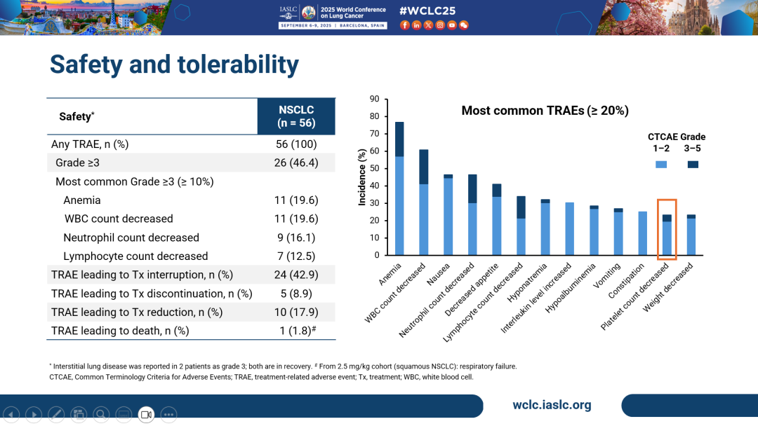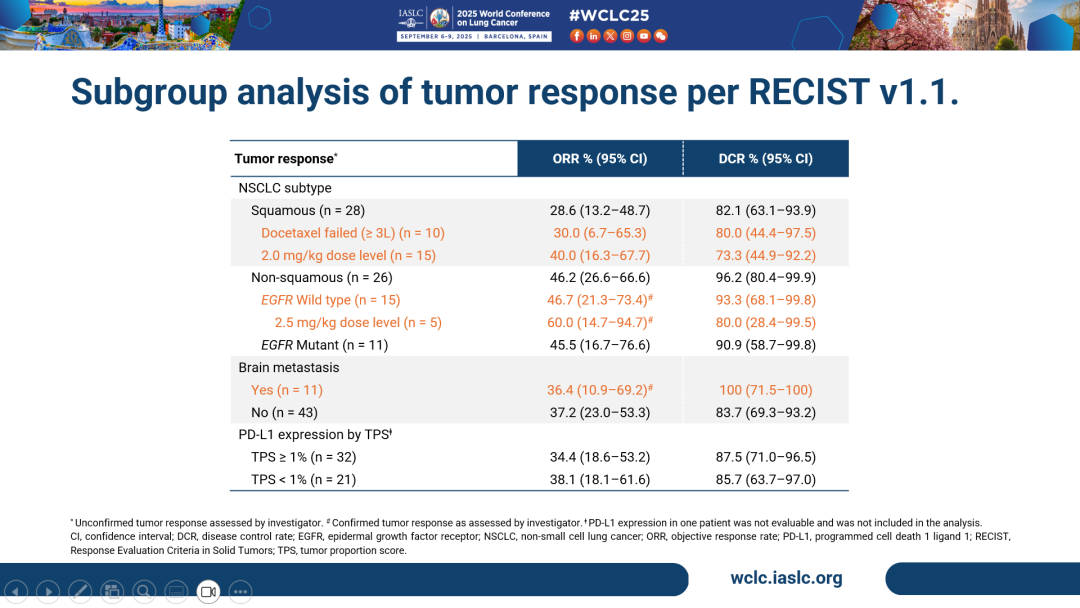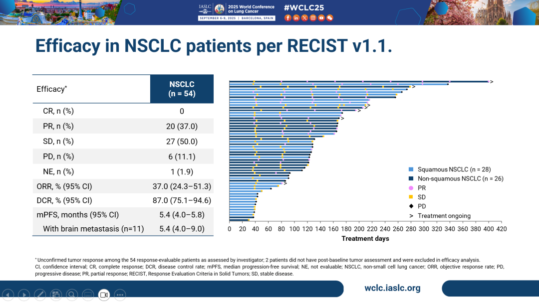 截至数据截止日期2025年6月28日,共计56例NSCLC患者入组Ia期及Ib期2.0和2.5 mg/kg剂量组,其中29例(51.8%)为鳞状,27例(48.2%)为非鳞状。鳞状NSCLC中,10例(34.5%)患者经多西他赛治疗失败。非鳞状NSCLC中,EGFR野生型/突变患者分别为15例(55.6%)及12例(44.4%)。