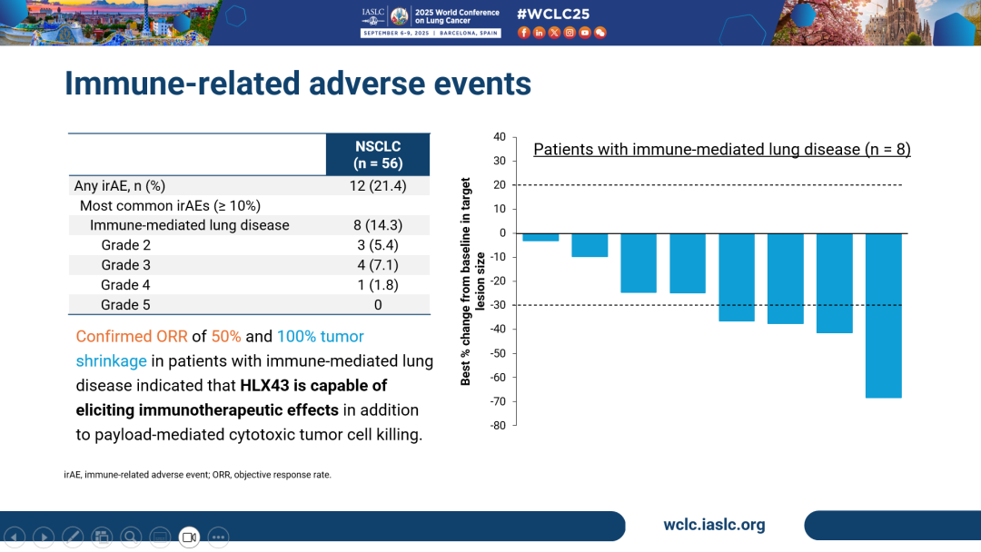 • 同时,在发生免疫相关性肺病的患者人群中观察到更高的治疗获益,包括50.0%的cORR 及100%的肿瘤缩小率,提示HLX43可能“双管齐下”,其疗效经由小分子毒素以及免疫机制介导。