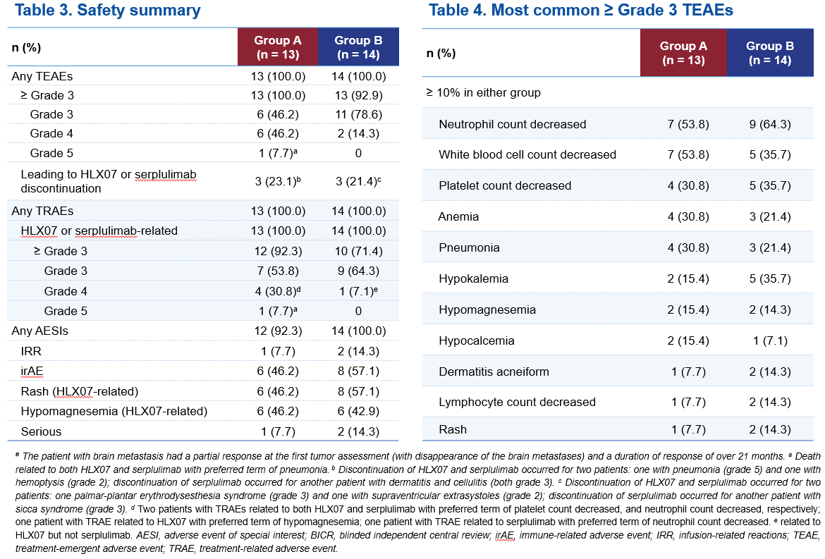 截至2025年3月5日,共有27例患者参与并随机分配至研究第3部分的A组(n=13)或B组(n=14)。两组患者分别每三周一次接受800 mg HLX07(A组)或1000 mg HLX07(B组)联合300 mg斯鲁利单抗和化疗。15例(55.6%)患者患有转移性sqNSCLC。中位随访时间为18.6个月。