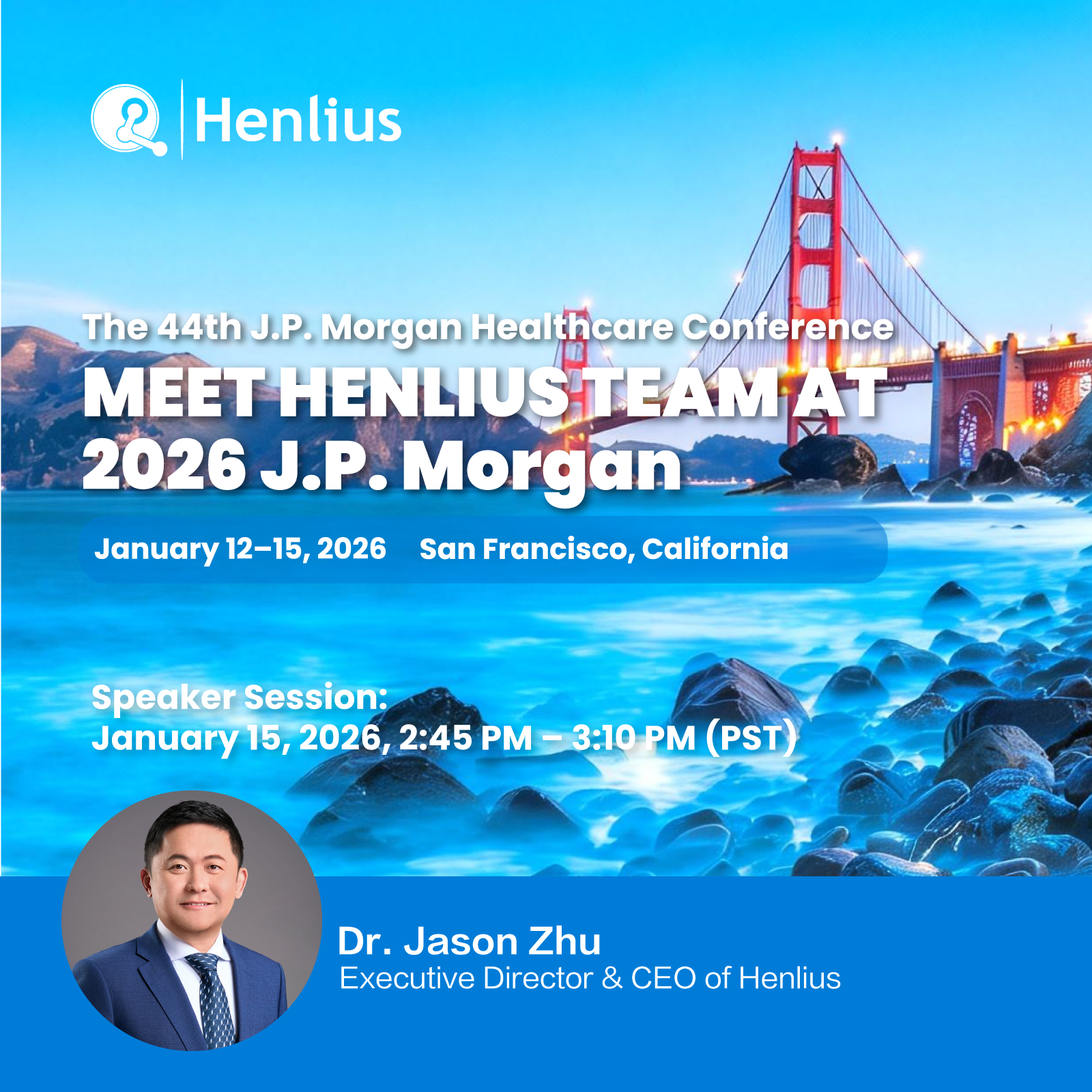 The 44th J.P. Morgan Healthcare Conference will be held from January 12 to 15 in San Francisco, United States. As one of the most influential annual events in the global healthcare sector, the JPM Conference is widely regarded as a key window for the global capital markets to observe trends in pharmaceutical innovation and industry development. Dr. Jason Zhu, Executive Director and Chief Executive Officer of Henlius (2696.HK), will deliver a corporate presentation on January 15 (PST), during which he will systematically share the Company’s latest progress and long-term vision with international investors and industry stakeholders, focusing on Henlius’ Globalization 2.0 strategy, innovation pipeline layout, and mid- to long-term strategic planning.